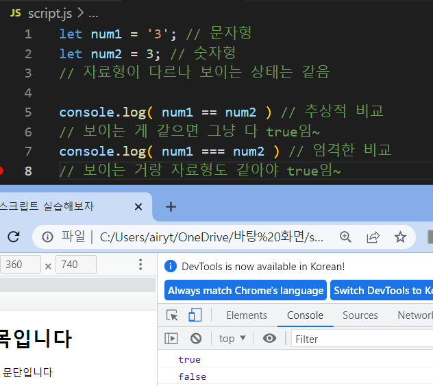 === : 엄격한(strict) 같음 비교, 자료형과 데이터가 모두 일치해야만 같다고 판단