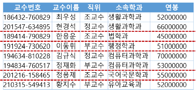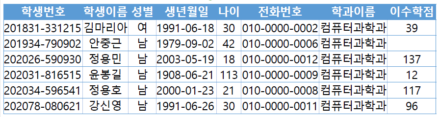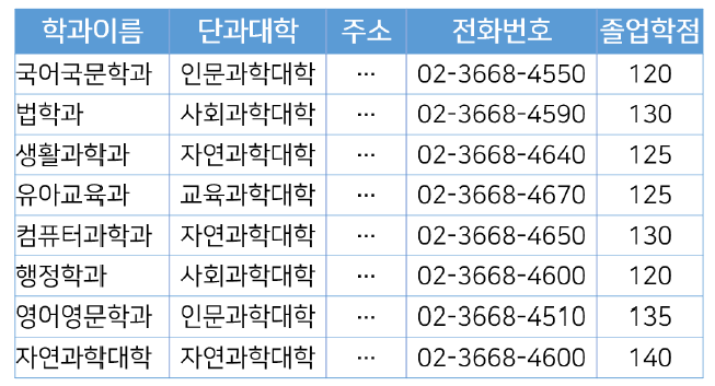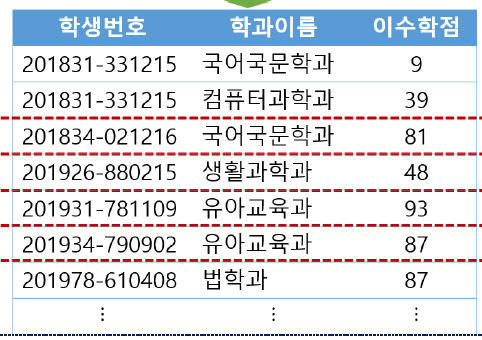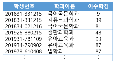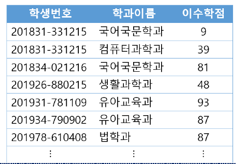 SELECT 학생.*, 전공.학과이름, 전공.이수학점 FROM 학생 NATURAL JOIN 전공 WHERE 전공.학과이름='컴퓨터과학과' ![]() |
