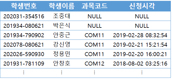 FROM 학생 AS A LEFT OUTER JOIN 수강 AS B