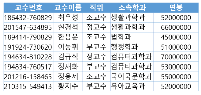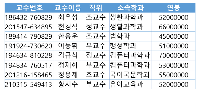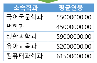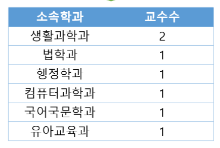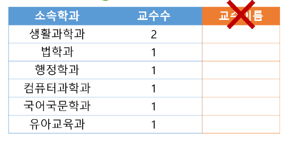 교수이름 컬럼이 오게 되면 학과별 교수 이름 중 생활과학과는 컬럼값이 2개 들어감.