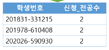 | SELECT 학생번호, COUNT(*) AS 신청_전공수 FROM 전공 GROUP BY 학생번호 |