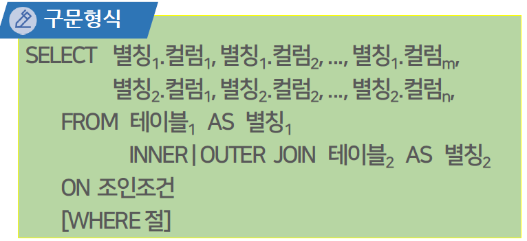 SELECT 별칭1.컬럼1, ... , 별칭n.컬럼m, FROM 테이블1 AS 별칭1 INNER/OUTER JOIN 테이블2 ON 테이블이름1.컬럼 = 테이블이름2.컬럼 [WHERE 조건] |