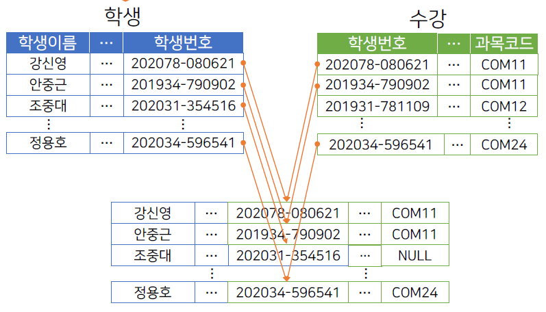 | • 왼쪽 외부 조인(left outer join) 왼쪽에 있는 테이블에 존재하는 모든 레코드는 조인 결과에 포함되고, 조인 조건에 맞는 오른쪽 레코드만 연결됨. • 오른쪽 외부 조인(right outer join) 오른쪽에 있는 테이블에 존재하는 모든 레코드는 조인 결과에 포함되고, 조인 조건에 맞는 왼쪽 레코드만 연결됨. • 완전 외부 조인(full outer join) 양쪽에 있는 테이블에 존재하는 모든 레코드는 조인 결과에 포함되고, 조인 조건에 맞는 레코드만 연결됨. |