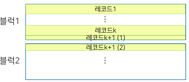 | 블럭의 길이가 레코드 길이로 정확히 나눠지지 않아 잔여 공간을 비워두는 방법 | 블럭의 길이가 레코드 길이로 정확히 나눠지지 않아 한 레코드를 두 블럭으로 나누어 저장하는 방법 |