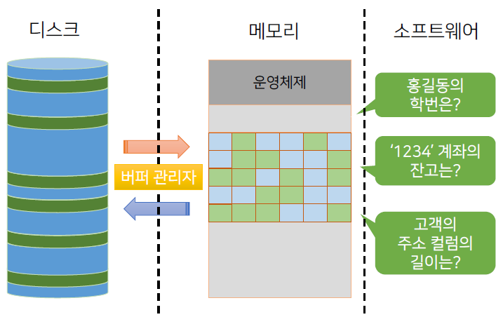 운영체제 위에 있는 DBMS가 관리하는 메모리에 소프트웨어의 요청이 있을 때마다