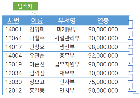 | 순차 파일 구조 | 레코드들이 탐색키 기준으로 정렬되어 저장, 실질적으로 가장 많이 사용됨. 이진 탐색 방법을 사용하여 빠른 속도로 검색할 수 있는 것이 순차파일 구조임. · 장점 : 레코드가 탐색키 기준으로 정렬되어 저장되므로 빠른 탐색 성능을 가짐. · 단점 : 레코드의 삽입 및 삭제가 비효율적임. 정렬 상태를 유지하기 위한 추가 작업 필요함. → 저장은 느리지만 탐색은 빠름. |