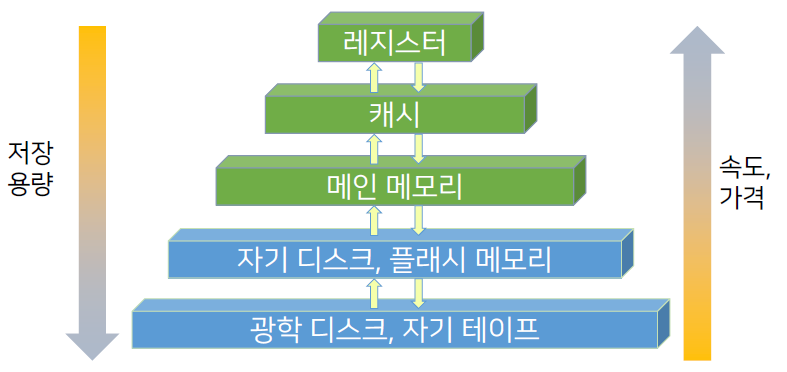 하위로 갈수록 저가이고, 비휘발성, 용량이 적고, 데이터 접근에 소요되는 시간이 증가함.