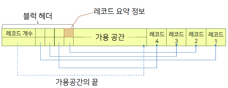 신규 레코드는 슬롯 페이지의 중간에 있는 가용 공간의 뒤쪽에서부터 저장되는데 이를 위해 블럭 헤더에 가용 공간의 끝에 대한 위치가 저장됨.