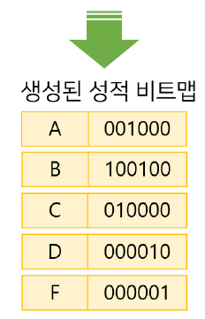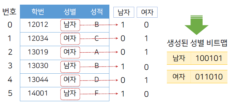 → 컬럼값의 종류만큼 비트맵이 생성, 각 비트맵은 릴레이션의 레코드 수만큼 비트를 가짐.
