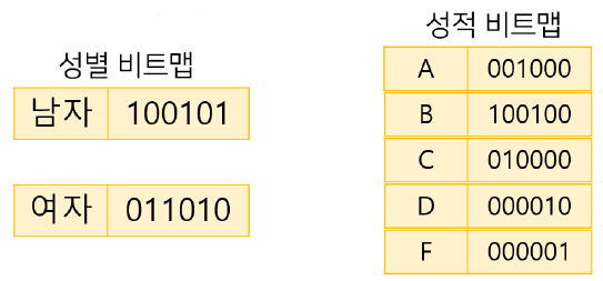 - 릴레이션 r의속성 A에 대한 비트맵 인덱스는 A가 가질 수 있는 값에 대해 비트맵을 구성