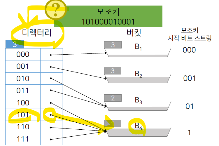 즉, 버킷이 포화상태인 경우 디렉터리 깊이를 하나 증가시켜 디렉터리를 확장시킨 후 포인터가 적절히 조정됨.