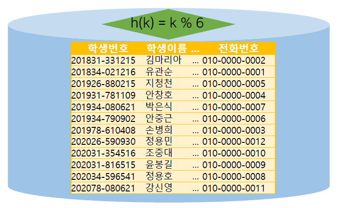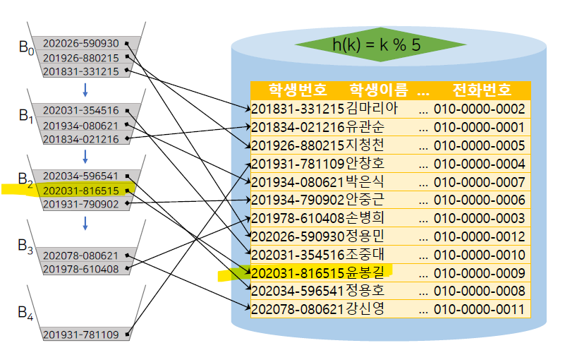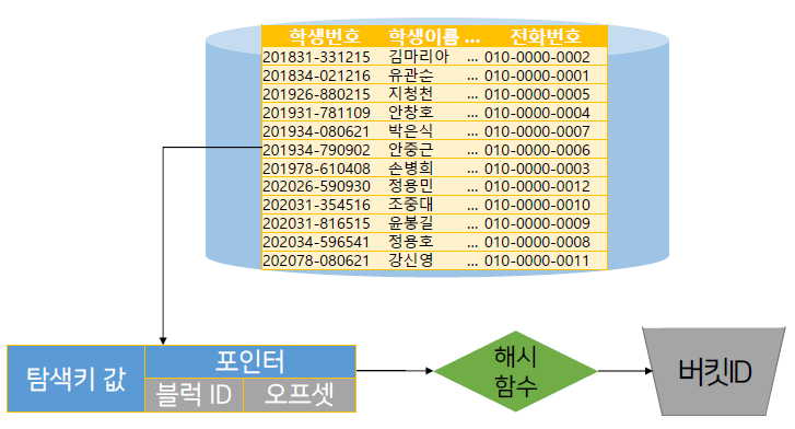 · 다른 학생들 : 해시 함수에 학번을 순차적으로 적용하여 해당 학생 레코드에 인덱스 엔트리가 저장됨.