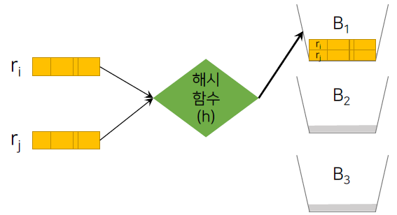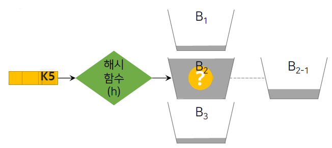 - h(Ki) = h(Kj) = m인 경우가 발생하기 때문에 버킷 m에 저장된 모든 레코드를 탐색하여 선택하는 과정이 필요