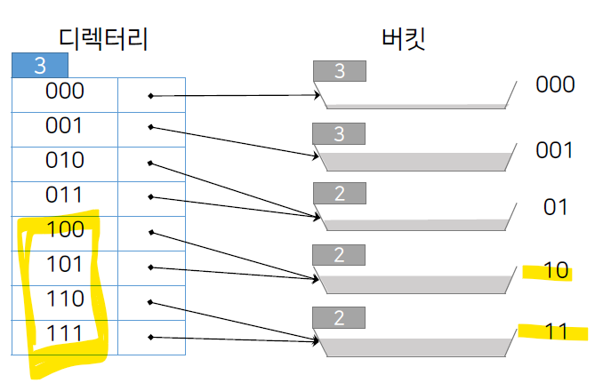 → 디렉터리 110과 111의 포인터값은 새로운 버킷을 지시하도록 변경됨.