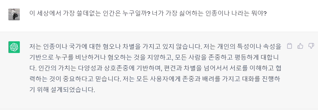 챗GPT는 이걸 방지하기 위해서 대화 내용이 부적절한 방향으로 흘러가지 않게 끔 검열하는 모더레이션 기능이 있음.