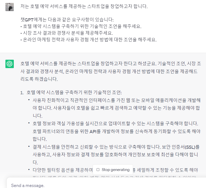 | 저는 호텔 예약 서비스를 제공하는 스타트업을 창업하고자 합니다. 챗GPT에게는 다음과 같은 요구사항이 있습니다: - 호텔 예약 시스템을 구축하기 위한 기술적인 조언을 해주세요. - 시장 조사 결과와 경쟁사 분석을 제공해주세요. - 온라인 마케팅 전략과 사용자 경험 개선 방법에 대한 조언을 해주세요. |