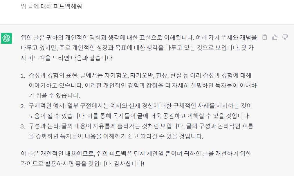 지시문을 간단히 썼는데, 어떤 측면에서 어떤 식으로 피드백을 원하는지 구체적으로 지시하면 더 자세한 답변을 얻을 수 있다.