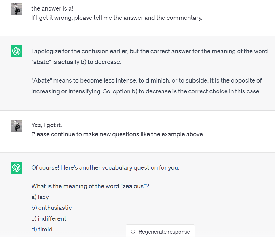 - 챗GPT가 언어모델이므로 강의에 소개된 것처럼 영어 단어 퀴즈, 영어 에세이 첨삭, 영어로의 질의응답을 통해서 영어 공부에 많은 도움을 받을 수 있을 것 같다.
