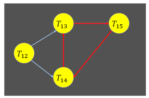 트랜잭션 T12는 트랜잭션 T13과 T14를 기다리고 있다. 트랜잭션 T13은 트랜잭션 T15를 기다리고 있다. 트랜잭션 T14는 트랜잭션 T13을 기다리고 있다. 트랜잭션 T15는 트랜잭션 T14를 기다리고 있다. 이 그래프는 사이클 T13 → T15 → T14를 포함하고 있음. 트랜잭션 T13, T14, T15는 교착상태에 있음. |