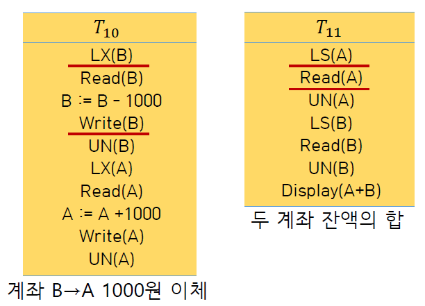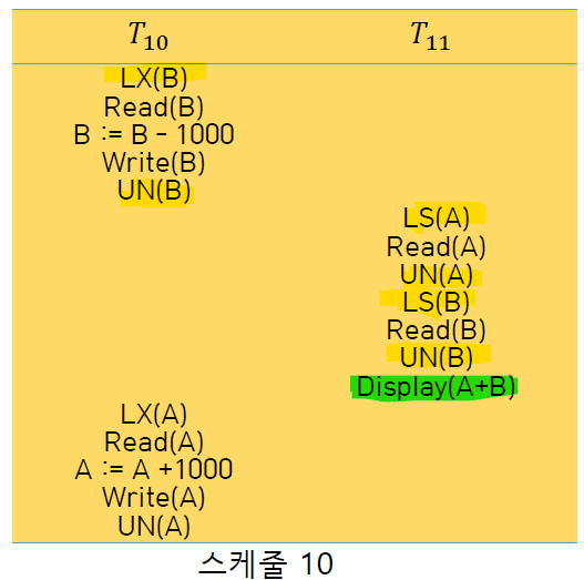 | T10 : Write(B)를 위해서 B에 대한 배타 락(LX(B))을 걸어둠. T11 : Read(A)를 위해서 A에 대한 공유 락(Read(A))을 걸어둠. |