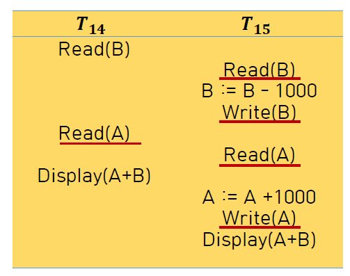 → 배타 락과 공유 락은 양립하지 못하므로 T13은 T12가 배타 락 반납할 때까지 기다림. ( LS(B)~ )