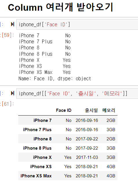 | column 위치의 리스트 슬라이싱 | df.iloc[:, 1:2] |