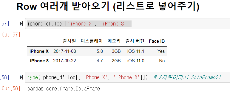 | row 이름의 리스트 | df.loc[['row1', 'row2', 'row3']] | |