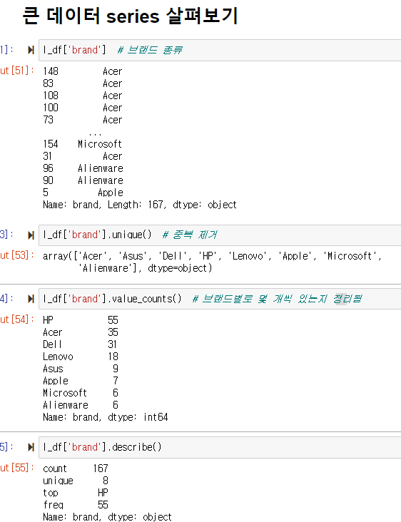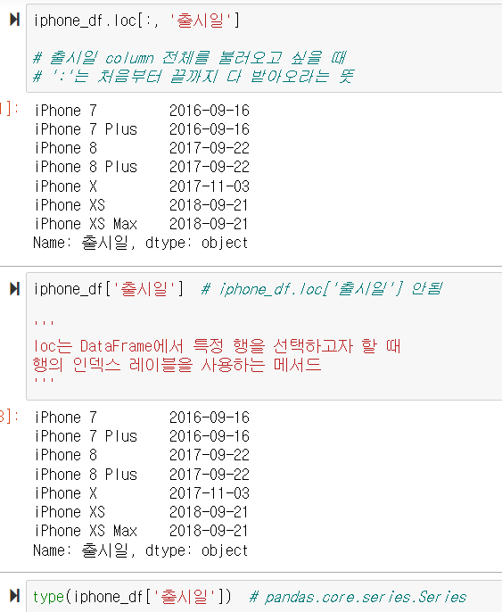 | 하나의 column 이름 | df.loc[:, 'col2'] | df['col2'] |