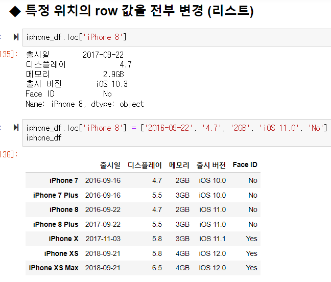 | row 위치의 리스트 슬라이싱 | df.iloc[2:5] | df[2: 5} |