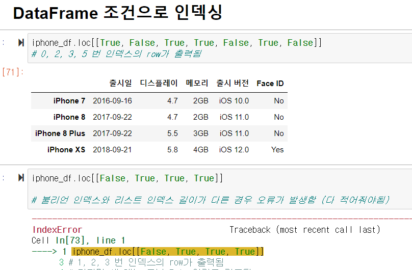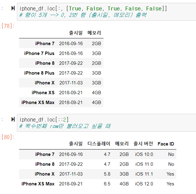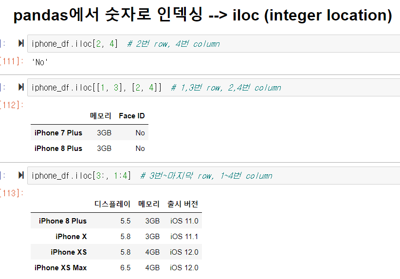 | row 위치의 리스트 | df.iloc[[2, 3, 6]] | |