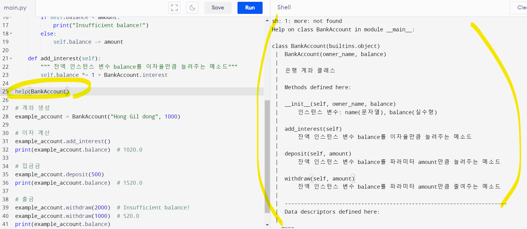 클래스의 코드를 직접 보기 전에 Docstring만 보고 싶으면 help함수 사용