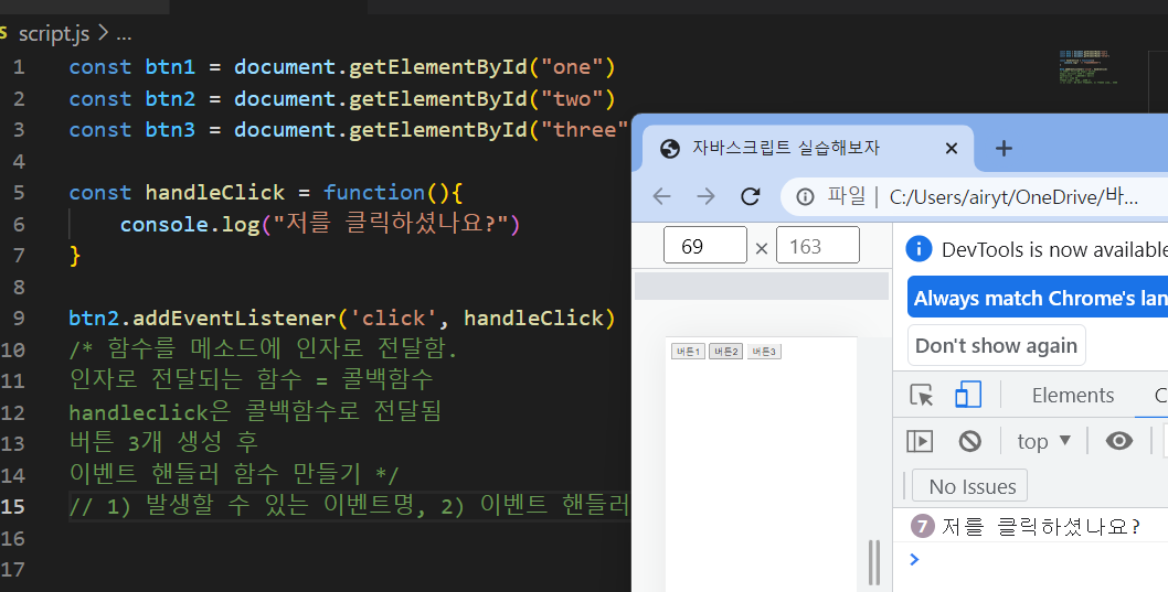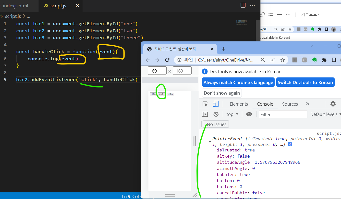 이벤트 객체 : 'handleClick'이라는 이벤트핸들러를 'btn2'의 'click' 이벤트에 등록함 이때 시스템에서 'click' 이벤트가 발생하면 '이벤트객체'라는 것을 'handleClick'에 전달해 줌. 그리고 그것을 이벤트 핸들러가 받아서 사용하려면 매개변수가 있어야 함. 이벤트 핸들러를 전달하는 매개변수는 주로 'event', 'e'라고 씀.