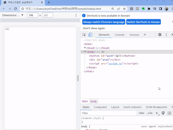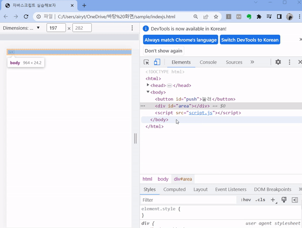 '눌러'라는 버튼을 눌러도 elements를 보면 div가 표시되지 않는 걸 알 수 있음.