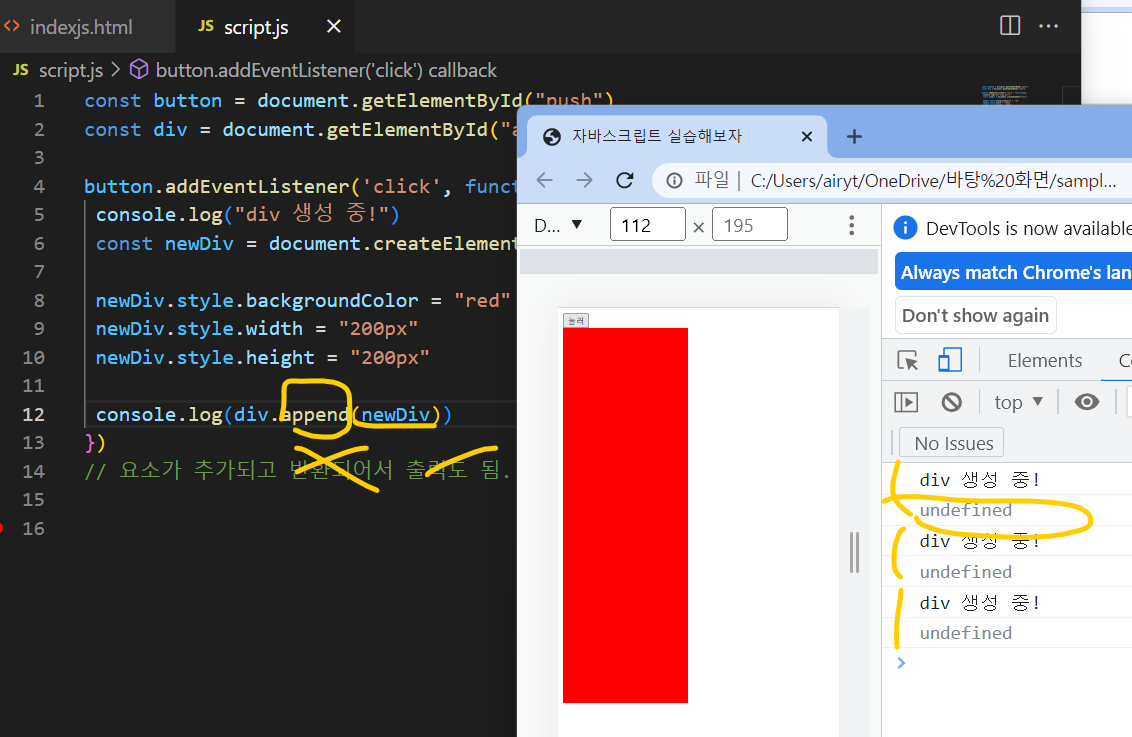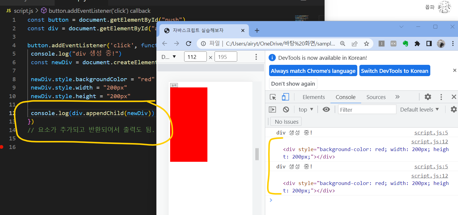 메소드 통해 만든 요소를 DOM에 추가해야만 브라우저에 렌더링 되는 것을 볼 수 있음.