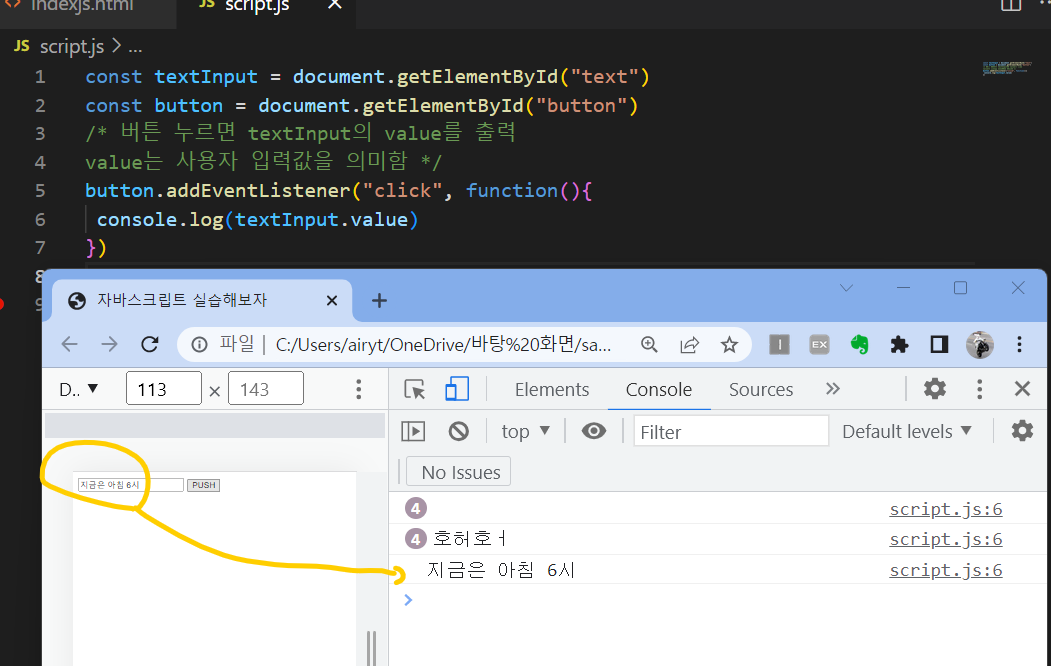 여기에서 사용자가 입력한 값을 읽어들일 때는 요소의 value 속성에 접근하자.