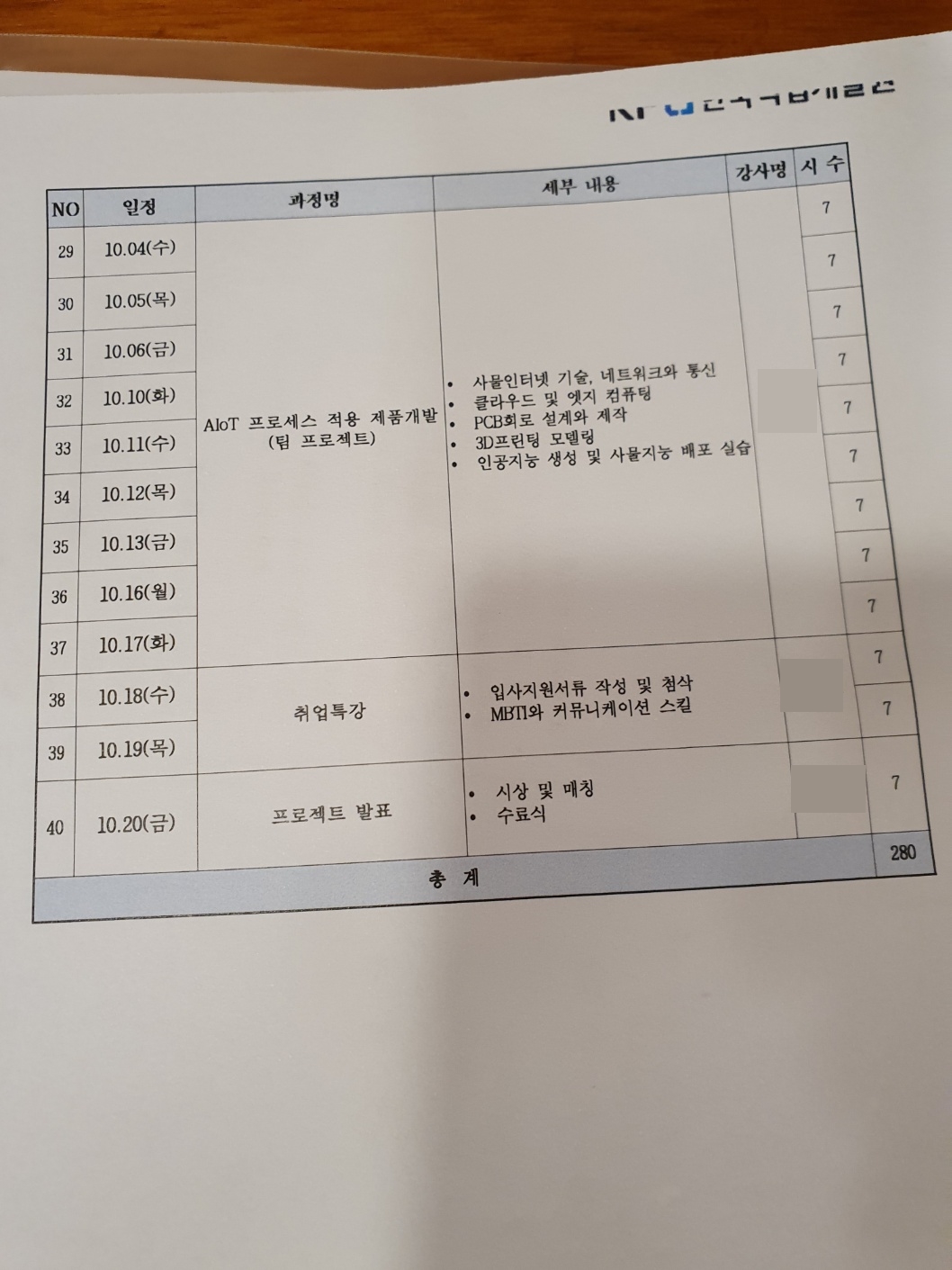 | 프로젝트 진행 | 강사님이 중간에 피드백을 해줌. (특히 하드웨어를 많이 쓰는 팀은 수강생이나 강사 모두 고생함.) 촉박한 프로젝트 기간 때문에 Front-end와 Back-end 설계는 하지 않음. |