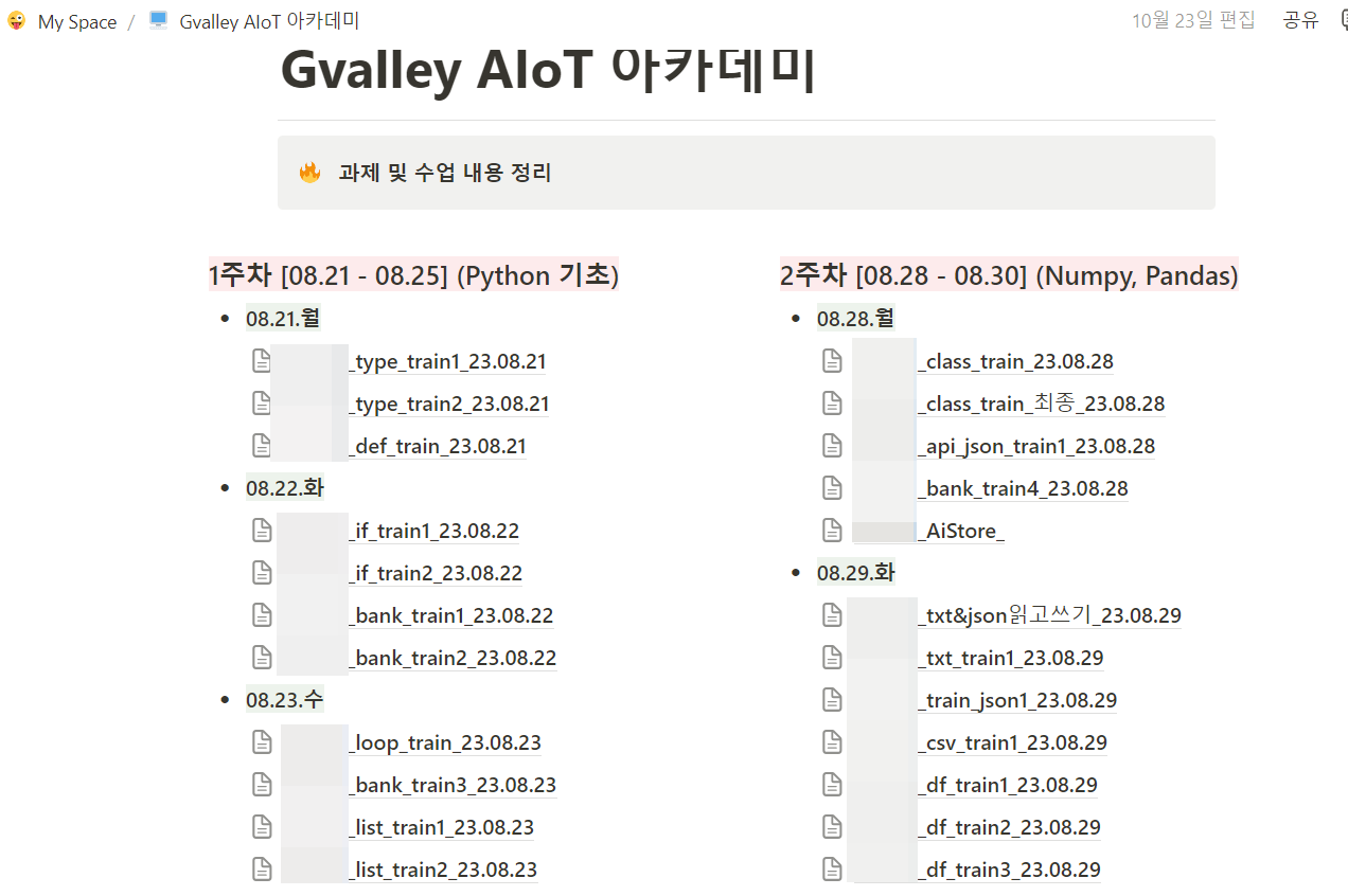 2주차 | 08.28-08.30 | Numpy, Pandas | Numpy와 Pandas를 통해 데이터분석을 하는 수업임. 지난 주차에 비해 난이도가 급상승함. 개인적으로 가장 실용적이고 도움이 되었던 수업임. |