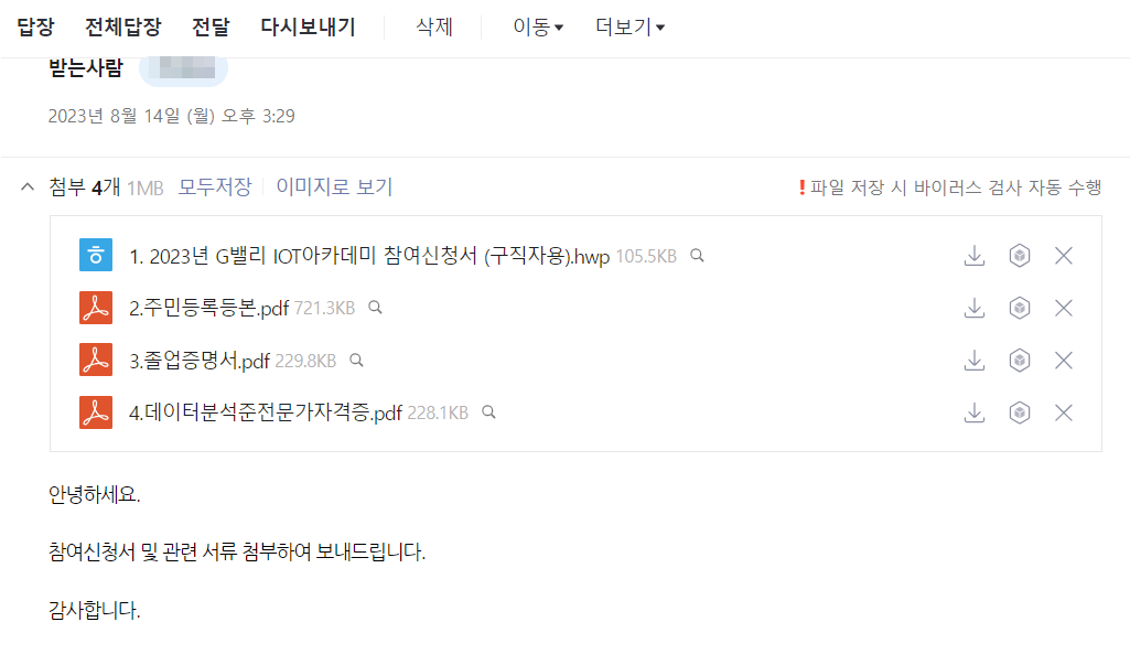 2. | 메일로 자기소개서 제출 안내 받음 | 작성해야 할 서류에 대해 안내를 받음. |