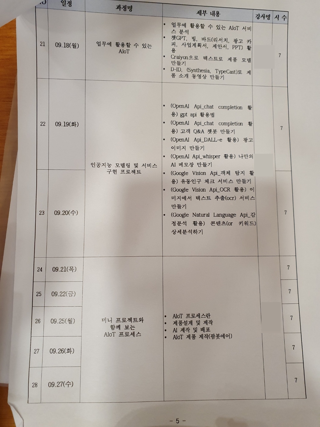| 5주차 | 09.18-09.22 | AI서비스 활용 RaspberryPi로 Iot 구현 |