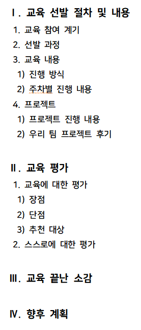 애매한 교육 목표와 과정 | • 교육내용이 'AI서비스 기획'이라는 목표에는 적절한 건 맞지만, 실제 취업시장에서는 도움이 되지 않는다. • 공고를 뒤져보면 AI기획자를 뽑는 곳이 가뭄에 콩나듯 한 곳 있을까 말까한 상황이다. • 협업이 있는 프로젝트임에도 불구하고 Github를 거의 활용하지 않는다. 이거 모르면 취업도 안 되는데, 강제로라도 가르쳐서 쓰게 해야되는게 아닐까 싶다. commit하는 방법만 알려줌. |