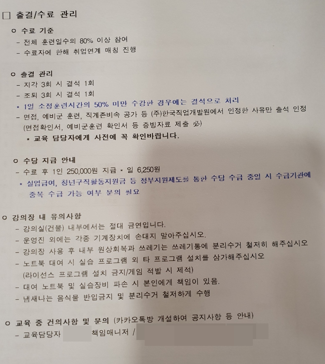 | 출결 | 출석일이 전체 수업일수의 80% 이상이면 수료증을 준다. 출결체크는 입구 쪽 출석부에 본인 이름을 서명하는 것이 전부이고, 지각체크는 하지 않는다. 오전 10시에 시작임에도 불구하고, 정각에 출석하는 사람이 드물어서 오전 수업은 지연이 많이 되었다. 큰 돈 내고 듣는 수업도 아니고, K-Digital Training이 아니라서 그런가 출결에 꽤 관대한 수업이었다. |