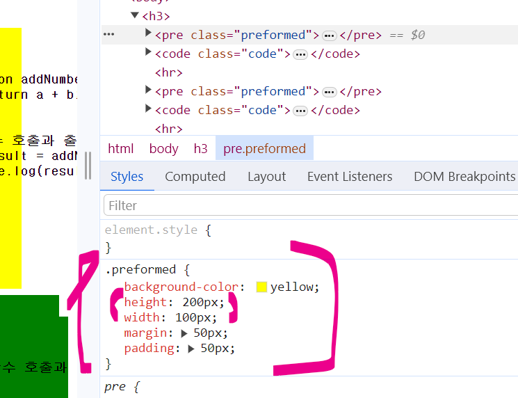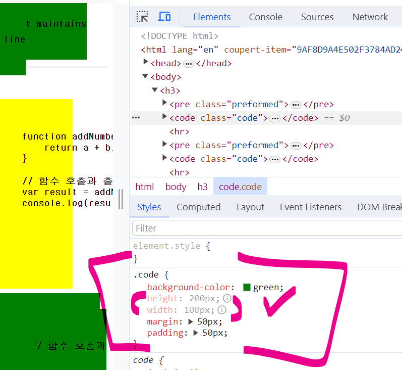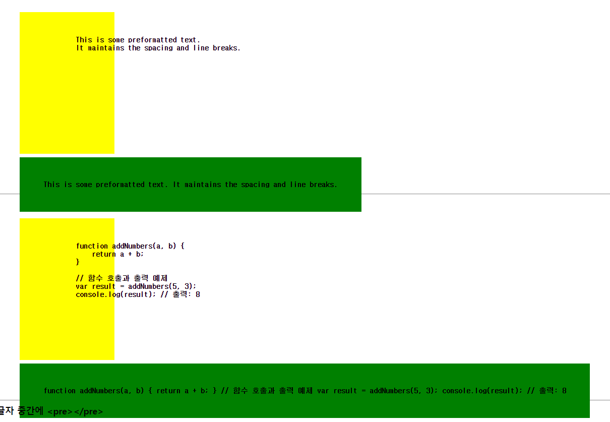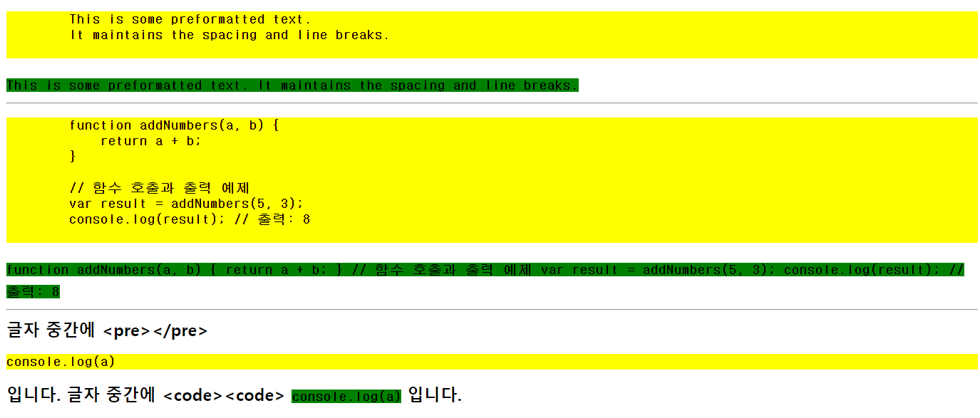 <pre> 태그가 적용된 영역은 노랑색, <code> 태그가 적용된 영역은 초록색으로 지정하였다.