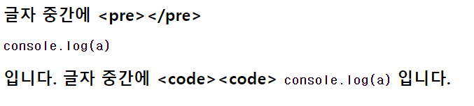 글자 중간에 <code><code> <code class="code"> console.log(a)</code> 입니다.