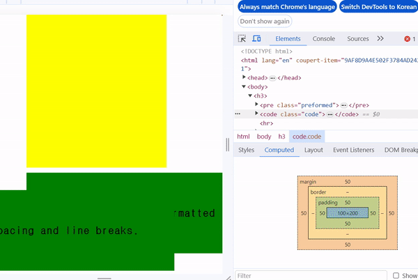 height와 width는 <pre> 태그 영역에는 적용이 되었고, <code> 태그 영역에는 적용되지 않았다.