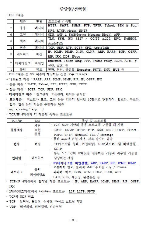 - OSI 7계층, TCP/UDP, VPN, RR(Round-Robin), 프로토콜 종류와 특징(SMTP, IGMP), 포트 번호와 같이 네트워크관리사에 빈출되는 개념들이 항상 똑같이 나오고 또 나온다.
