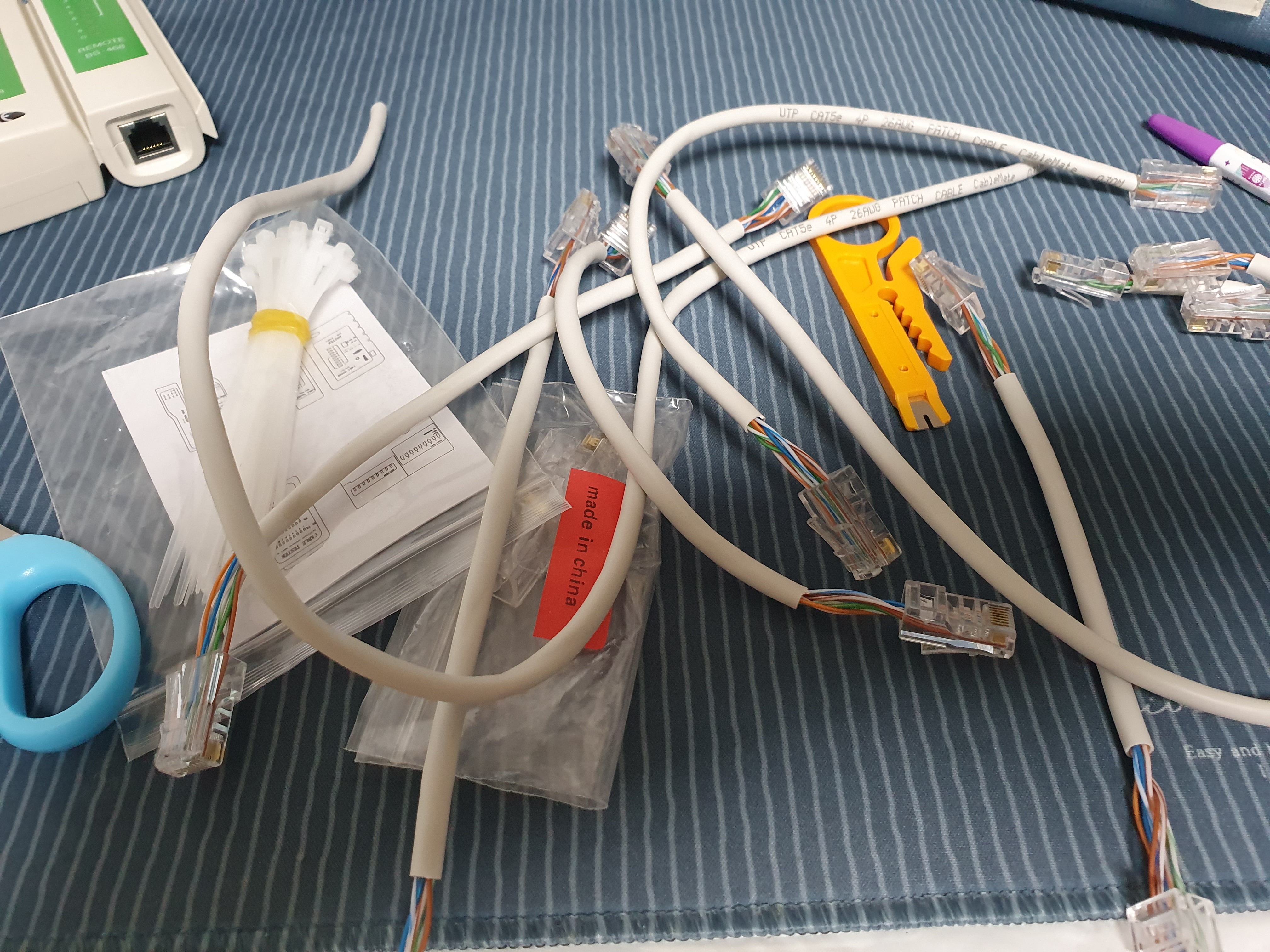 - 영상처럼 다이렉트/크로스 케이블을 순서대로 맞춰놓고 RJ45가 빠지지 않게 잘 집으면 끝난다.