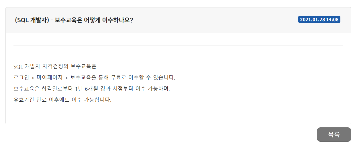 - 필기시험만 있어서 부담감이 적다. 프로그래머스에 있는 SQL 문제 풀이처럼 실기시험도 있었으면 합격률이 더 내려가지 않을까 싶다.