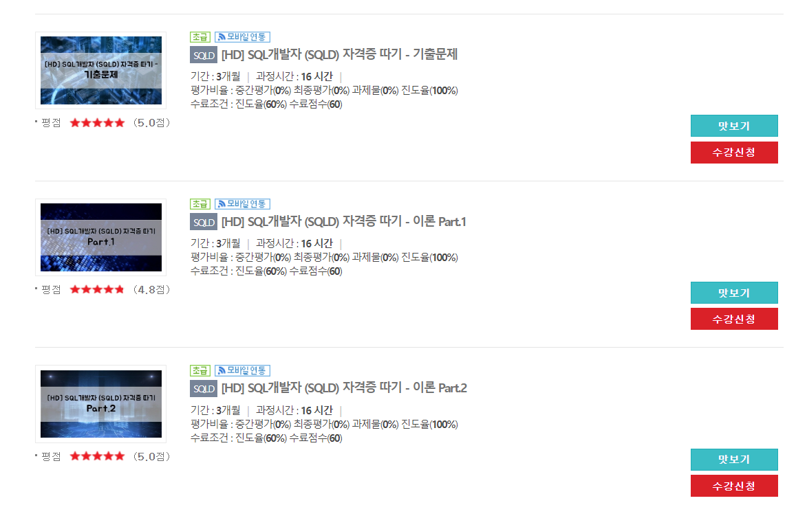 - 인천 e배움캠퍼스 : SQLD 대비용 이론과 기출문제 해설강의를 무료로 수강 가능