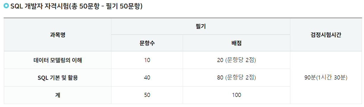 - 베이스가 있는 전공자라면 최대 7일, 기본적인 SQL 명령어도 모르는 노베이스 비전공자라면 2주 ~ 30일간 준비하면 된다. 직장인이면 한 달 정도 잡고, 시간 널널한 취준생 및 학생들은 며칠 정도만 벼락치기해도 충분히 합격할 수 있는 시험이다.