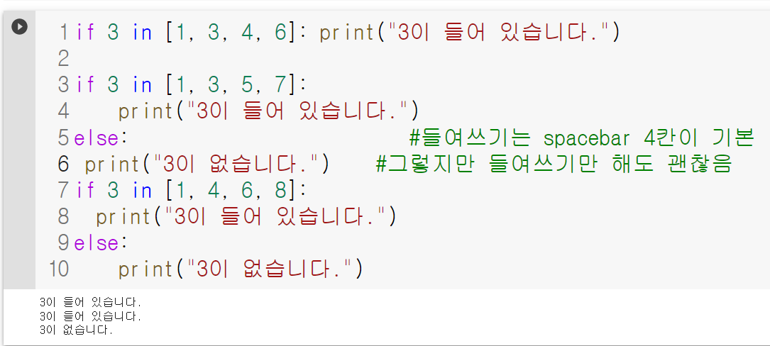 • 파이썬은 들여쓰기에 의존적인 언어 → 들여쓰기를 함부로 하면 안 됨.